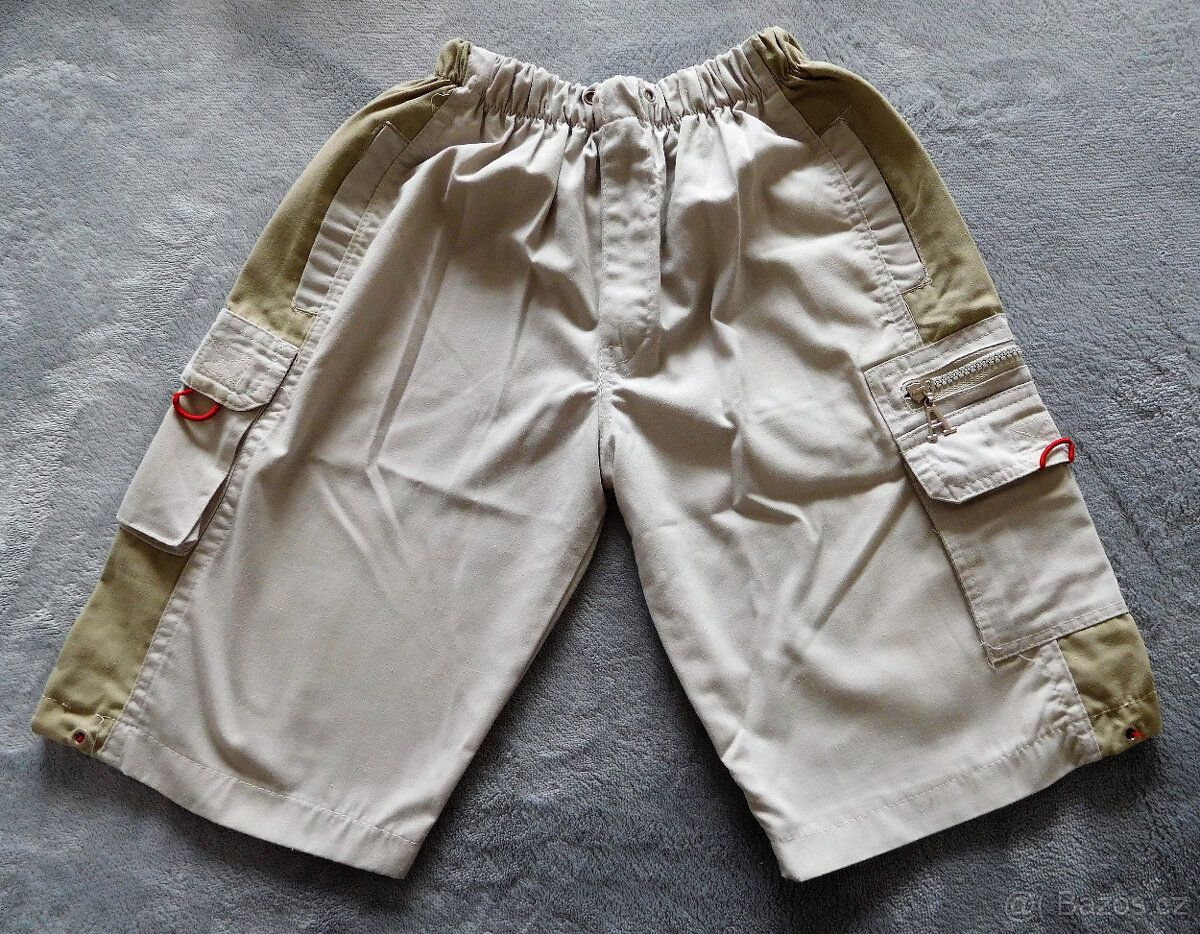 1)světlé kraťasy v pase do gumy s 6 kapsami,vel.10, cena 40,- Kč. V dobrém stavu.