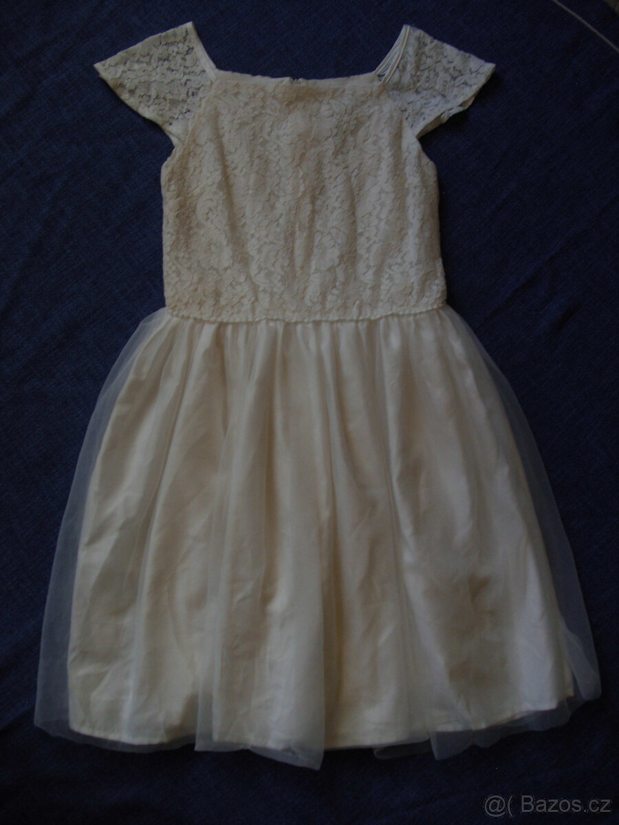 Stejné a krásné - např. pro sestřičky, sněhově bílé, krajkový horní díl, dvě spodničky (spodní z jemné bavlny, vrchní saténová), zapínání vzadu na skrytý zip. Pro slavnostní příležitosti, družička a pod. Vel. 152 - délka od ramene 85 cm, šířka v průramcích cca 2 x 37 cm.... Vel. 158 - délka od ramene 90 cm, šířka v průramcích cca 2 x 40 cm.