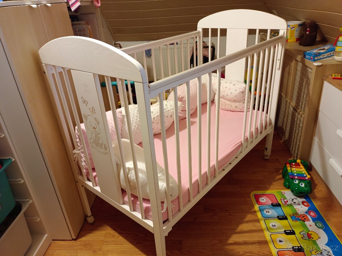 Nabízím na prodej dětskou postýlku o rozměrech 120x60, na kolečkách, vytahovací šprušle,všechny šprušle součástí nic nechybí , lze výškově nastavit, stahovací zábradlí, můžeme přidat matraci, nepromokavé prostěradlo. Mám také k dispozici vybavení do postýlky pro holčičku vše na dohodě. Nekuřácké prostředí. Vše v krásném stavu.