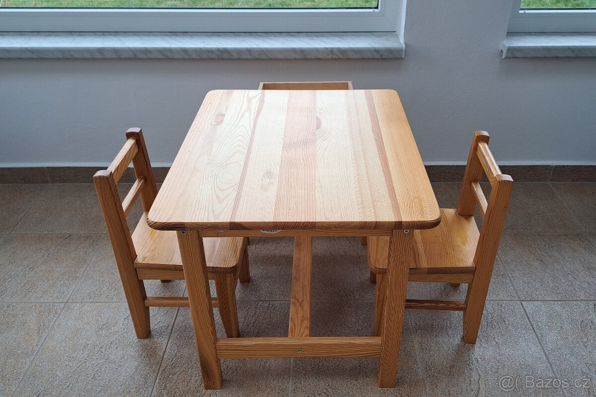 Kvalitni masivni borovicove drevo, česká vyroba. Nepomalované, velmi zachované. Přimontovaná polička na pastelky - možno odmontovat.