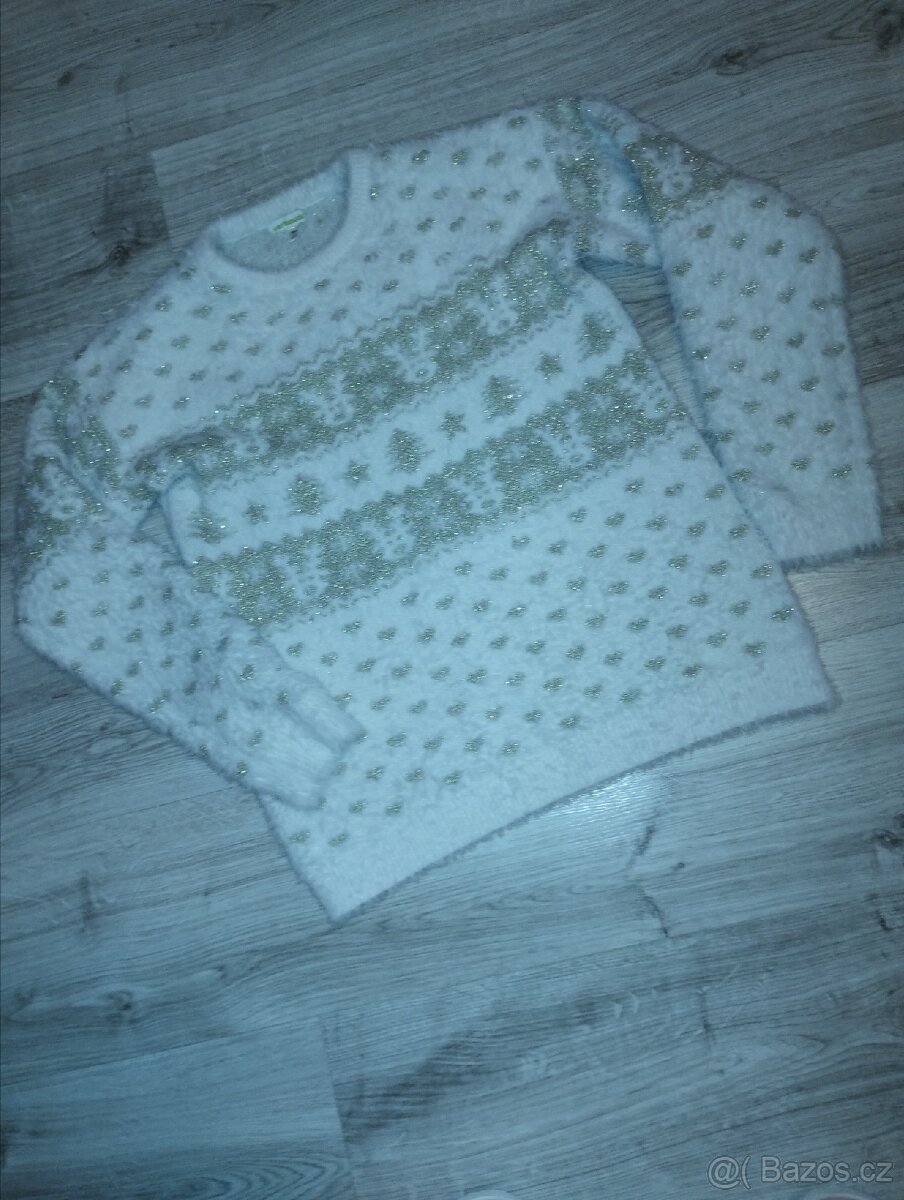 Prodám krásný měkký a hřejivý svetřík v bílé barvě se zlatým třpytivým vzorem (vánoční motivy – stromečky, hvězdy, zajíčci).