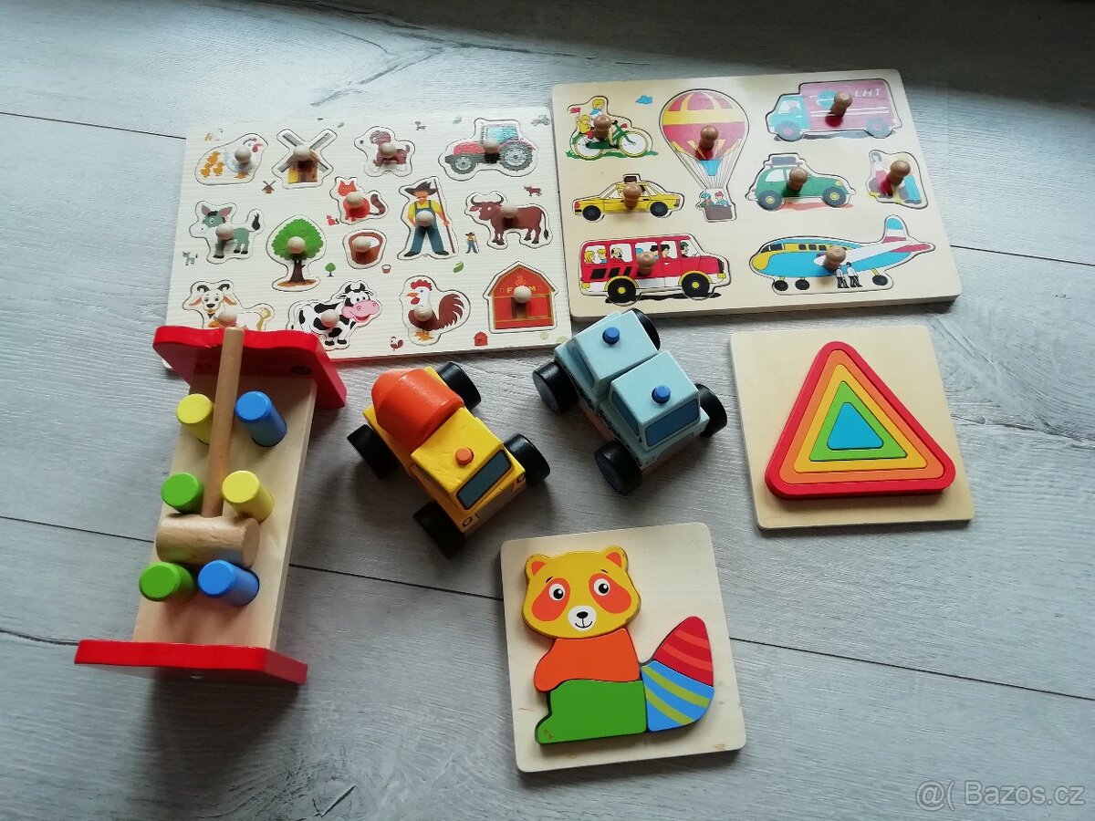 Prodám dřevěné hračky, 7 ks, v dobrém stavu, drobné oděrky. U vkládaček trochu pomalované podklady (viz foto). Cena za všechno.