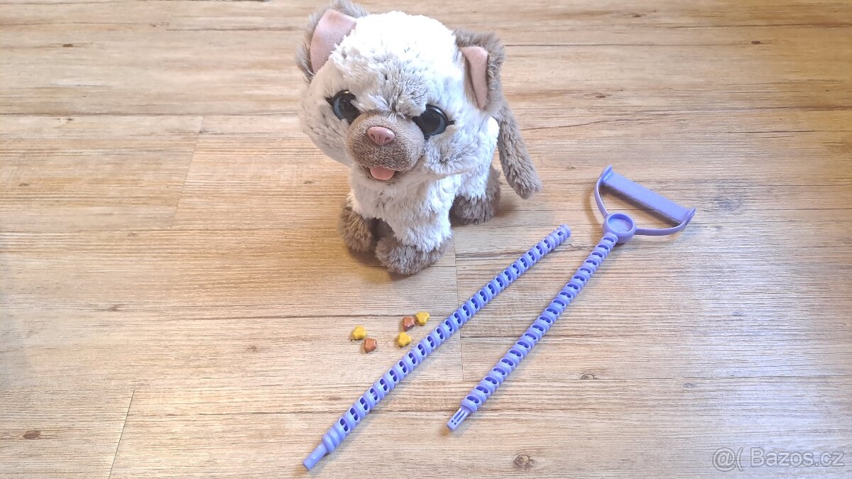 Prodám interaktivní kočku Furreal se zvukovými efekty a krmením, které po zmáčknutí zadních nožiček vypadne ze zadečku.