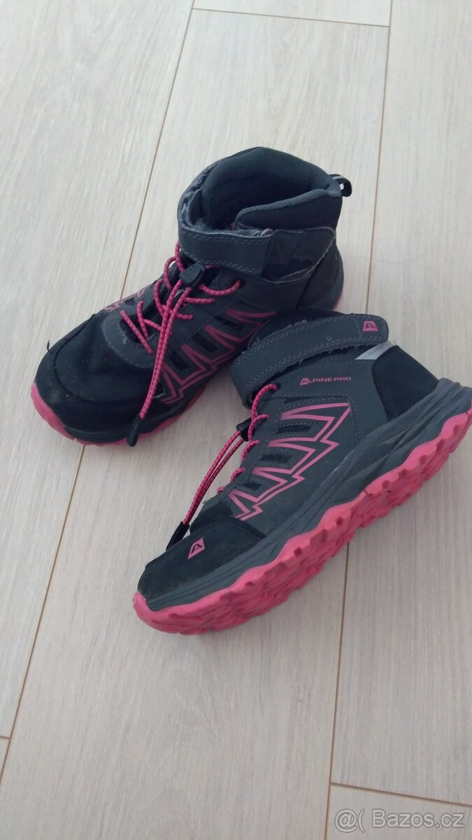 Dívčí kotníčkové boty Alpine Pro vel. 35, černo-šedé s růžovou, v pořádku, stahování na olivku, cena 250 Kč + zásilkovna 80 Kč. Platba předem na účet, platí do vymazání.