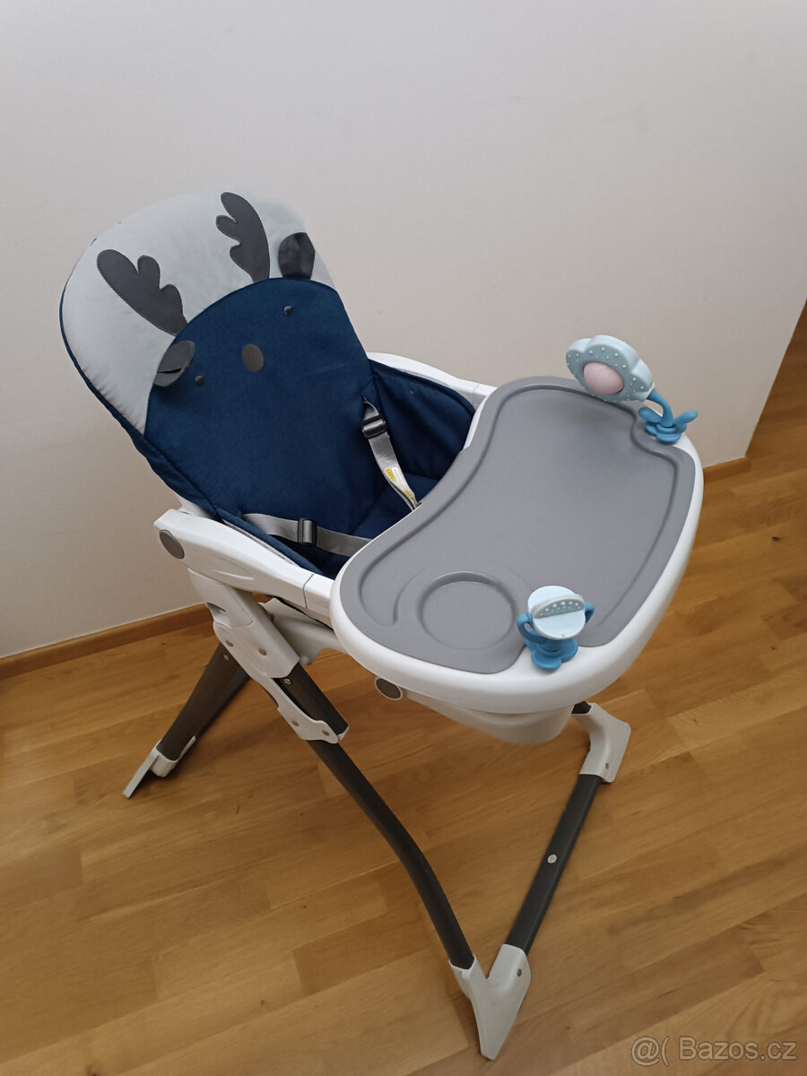 Dětská jídelní židlička ve velmi dobrém stavu. Pratelný látkový sedák, bezpečnostní pásy.