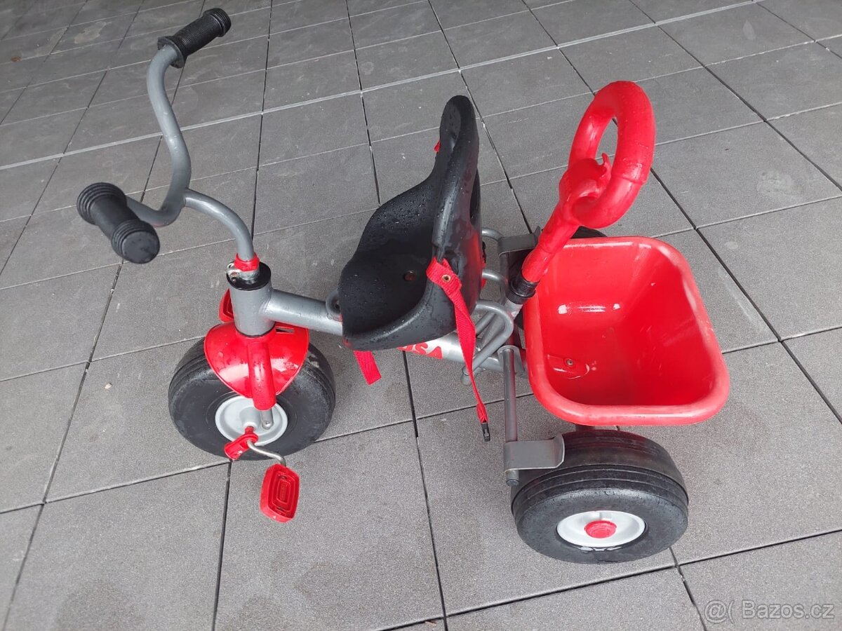 Prodám kovovou tříkolku. Při únavě jezdce jde použít kovová tyč na posouvání dítěte kupředu. Vozítko je lehce ovladatelné.