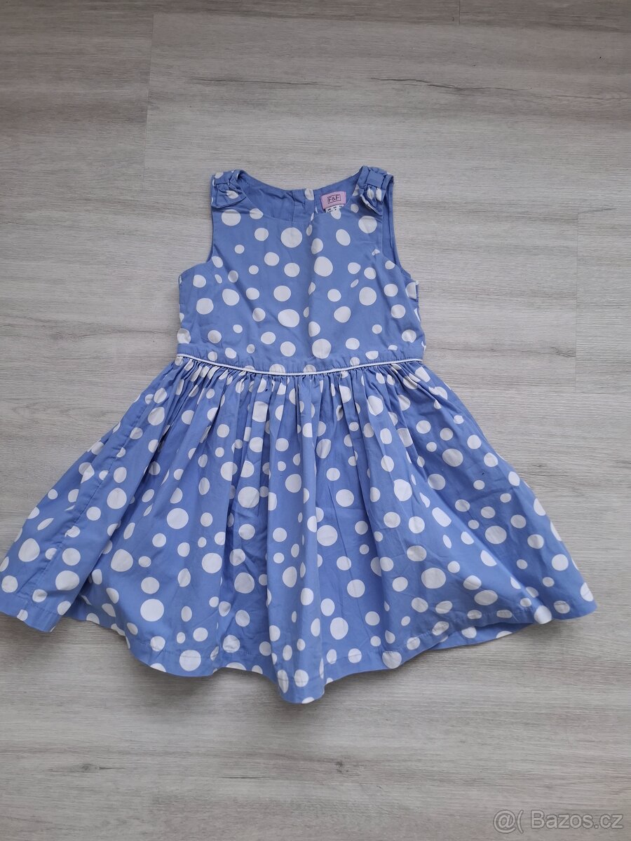 Prodám modré šaty s bílými puntíky zn.F&F, velikost 4-5 let. Jano nové, použito jen na focení. Celková délka 58cm