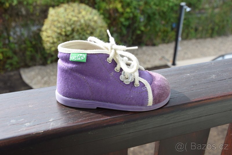 Dětské kotníkové bačkůrky tradiční české značky DPK. Jedny z nejkvalitnějších bačkůrek na českém trhu. Vrchní materiál textilie v kombinaci s koženou špičkou, která zabraňuje prošoupání během lezení, tvarovaná vkládací froté stélka pro podporu správného vývoje dětské klenby, pohodlí při chůzi, maximální tlumení nárazů. Kožený opatek. Bačkory poskytují dostatek opory pro začínající chodce. Zavazování na tkaničku. Certifikace Žirafa.