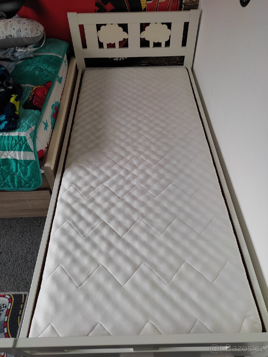 Dětská postel s roštem a zábranou, včetně nové matrace + navíc delší zábrana domácí výroby s chráničem pro děti s divokými sny