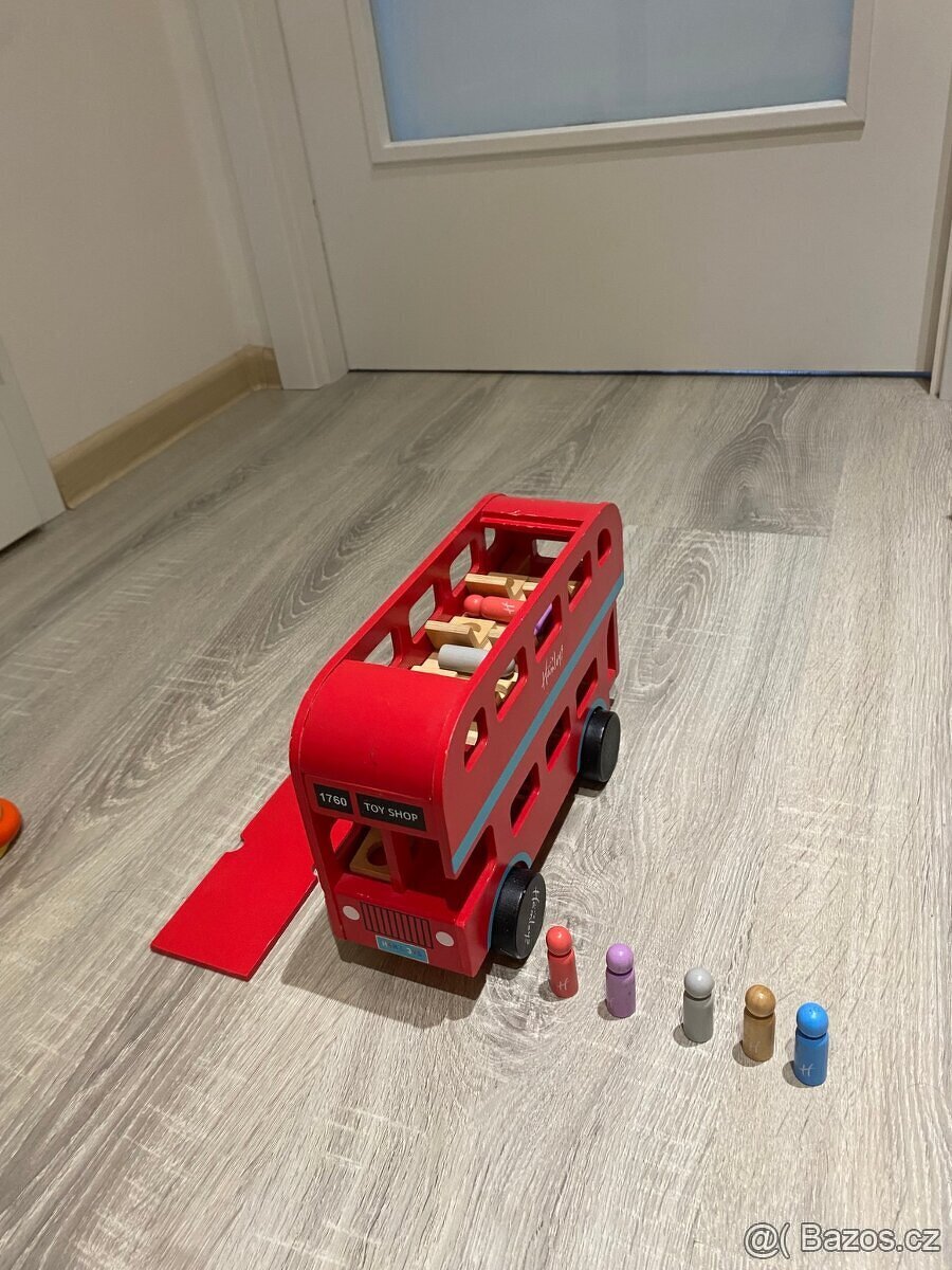 Součástí je i pět dřevěných figurek cestujících. Zadní část autobusu má odklápěcí dveře pro snadné hraní. Hračka je stabilní, kvalitně zpracovaná a vhodná i pro menší děti.