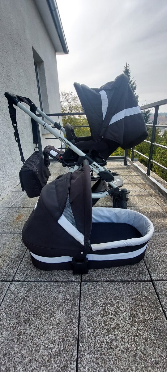 Set obsahuje kolečka, korbičku, sporťák. K tomu dokoupeno ve stejném provedení vajíčko do auta. Vše kompatibilní na jedny kolečka, stačí jen měnit. Dále Isofix do auta, veškeré originální přikrývky. Originál ...