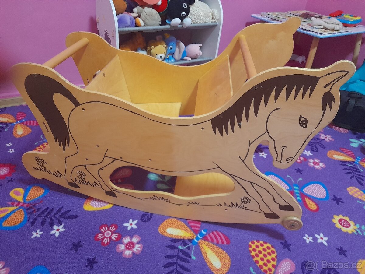 Prodám dřevěného houpacího koníka TriHorse 3v1 – lze používat jako houpacího koně, jídelní židličku nebo dětský stolek se sedátkem.