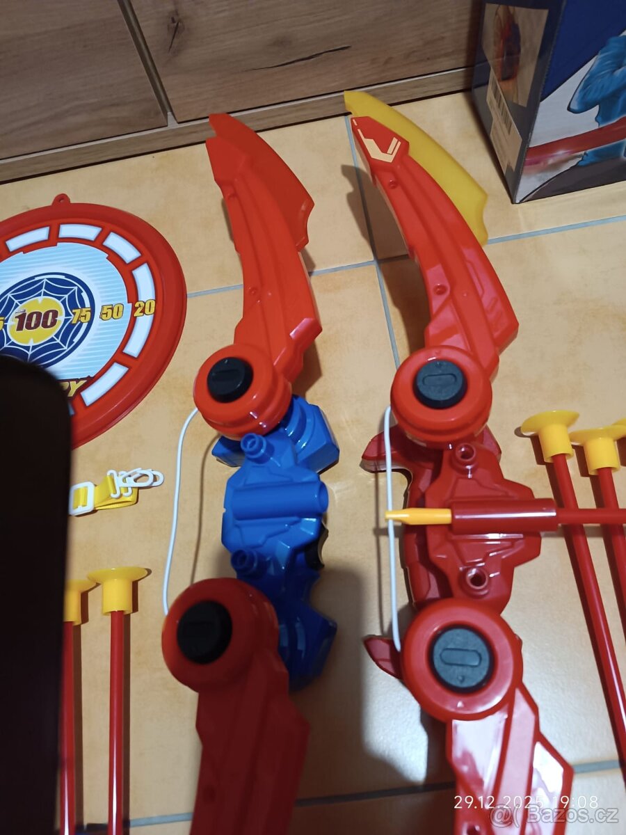 Sada luků obsahuje dva plastové luky, 12 šípů s přísavkou, dva toulce a plastový terč.