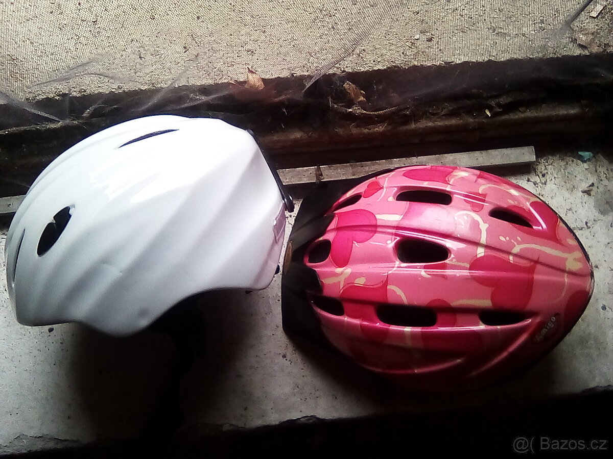 Nabízím cyklo a ski helmu. Cyklo růžová se srdíčky, lyžařská bílá. Obě na hlavu 53-55. Cena za jednu.