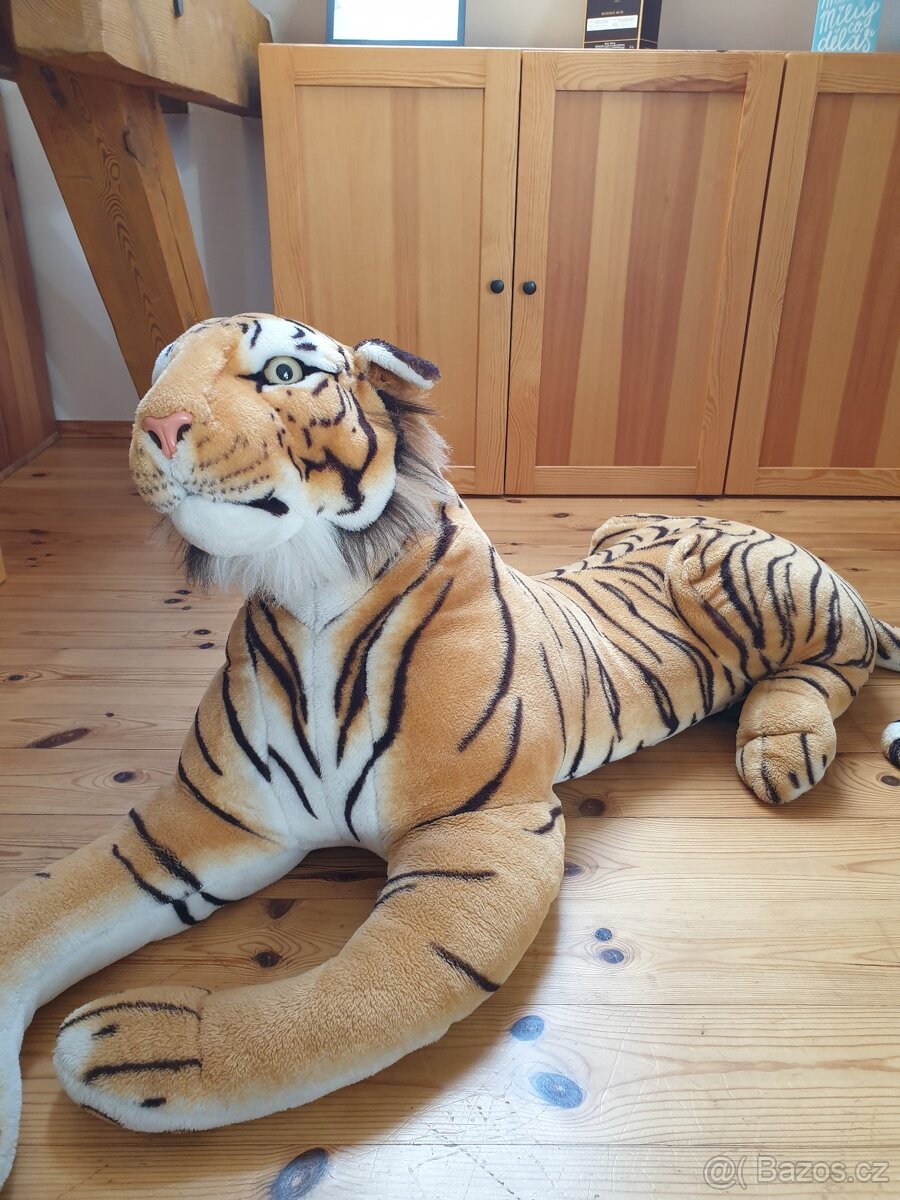 Tygr je pevnější, dobře drží tvar. Vhodný na hraní nebo jako velký plyšák do dětského pokoje.