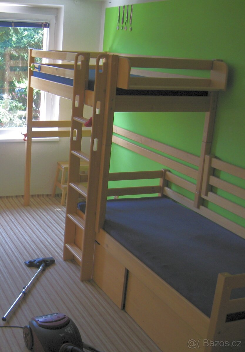 Prodám zachovalou patrovou postel z masivního dřeva (smrk + bezbarvý lak) od firmy DOMESTAV, která jde kombinovat do různých variant- palanda, vyvýšené lůžko, L-varianta ve dvou výškách. Díly jsou v pěkném stavu, jen přední deska spodní postele je více oťukaná používáním a víka šuplíků.