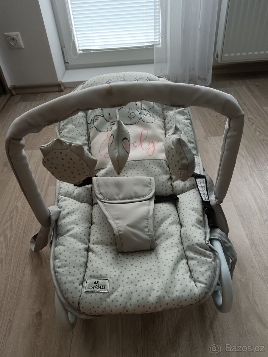 Nabízím po jednom dítěti houpátko, je vhodné od narození do cca 6 měsíců, nosnost max. 9kg, je samohoupaci, s možností zaaretovani. Lehátko má tři polohy, s hrazdičkou, a s popruhy na lepší přenášení. Sem tam flicek od příkrmu, nevím zda půjde vyčistit.