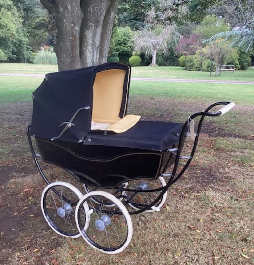 Marmet, skvělý stav a perfektní vintage kočárek pro akce, vintage kočárek z roku 1952, vyrobený pro kočárky, černý a krémový interiér na unikátní trubkové pružinové podpěře Morris, ve výborném stavu a krásný výstavní kus.