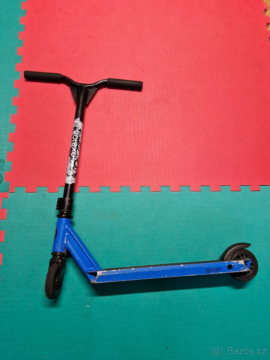 Dětská Freestyle koloběžka Oxelo FM One (Decathlon) Oodřený lak a gripy na řídítkách - běžné použití (viz foto). Ložiska, kolečka vše plně funkční.