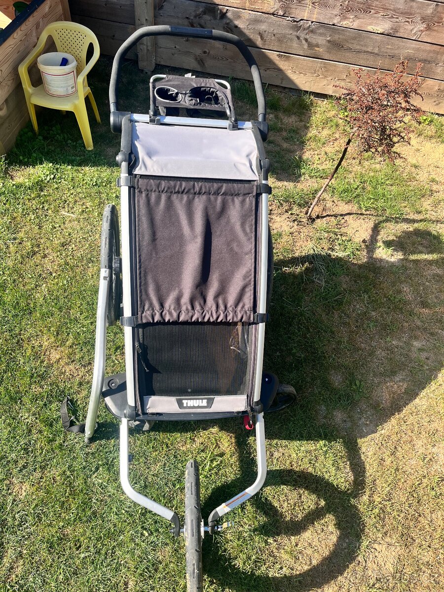 Prodám dětský thule chariot lite cyklovozík pro jedno dítě. Ve výborném stavu s drobnými oděrky viz foto. I s příslušenstvím: sluneční clona, pláštěnka, dva závěsy na kolo, běžecký set a organizér na odložení drobností a pití.