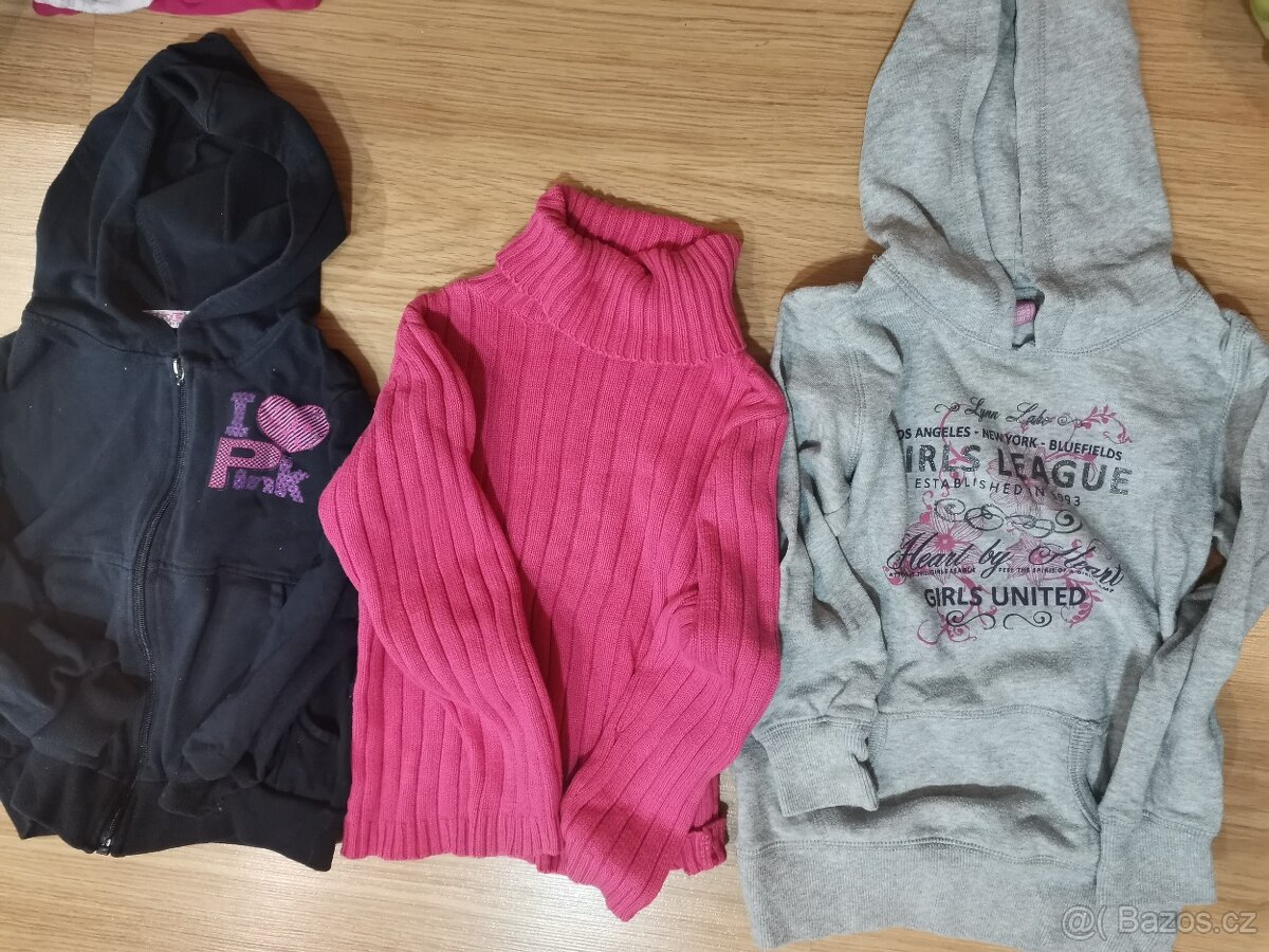 Mikina černá s kapucí 50 kč, růžový svetr, rolák dopodopo 75 kč, šedá mikina s kapucí dopo dopo 75 kč