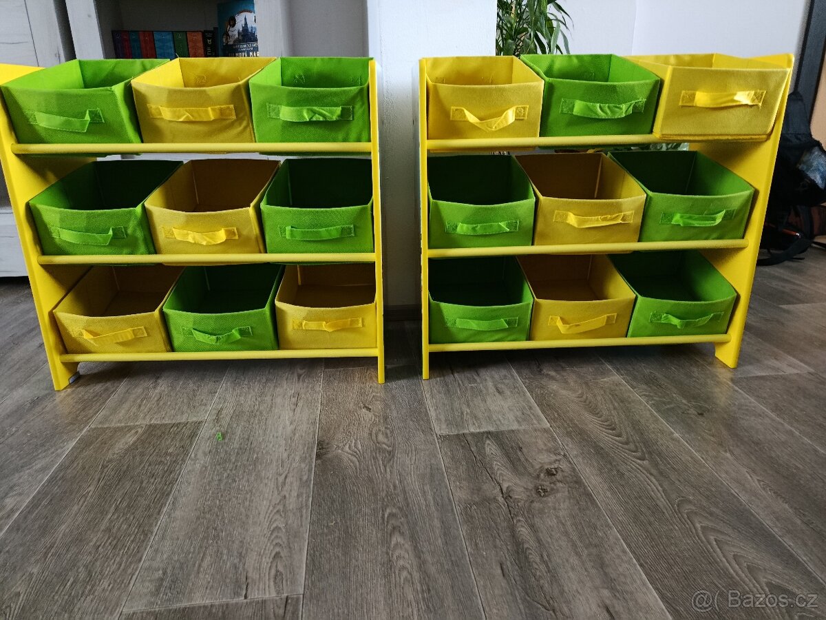 Prodám dva regály s boxi na hračky. Cena 450,- za kus.