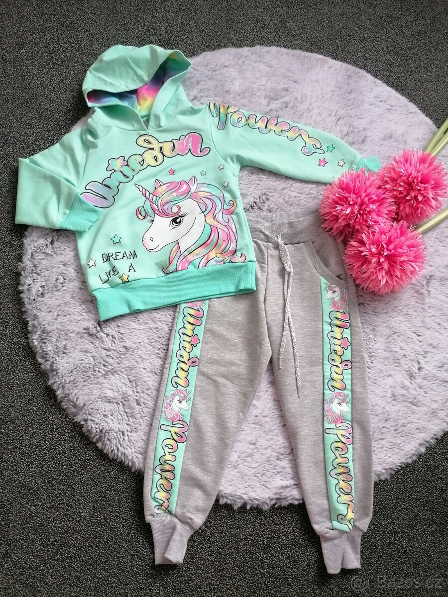 Nová, nenošená, dívčí souprava s jednorožcem, na malou slečnu velkou 3-4 roky. Mikina s kapucí, krásné třpytivé detaily obrazku. Tepláky v pase do gumy a mají šňůrku na stáhnutí. Opravdu nádherná, my na ni bohužel zapomněli a teď je nám malá. Mrkněte i na mé ostatní nabídky, nabízím toho více!