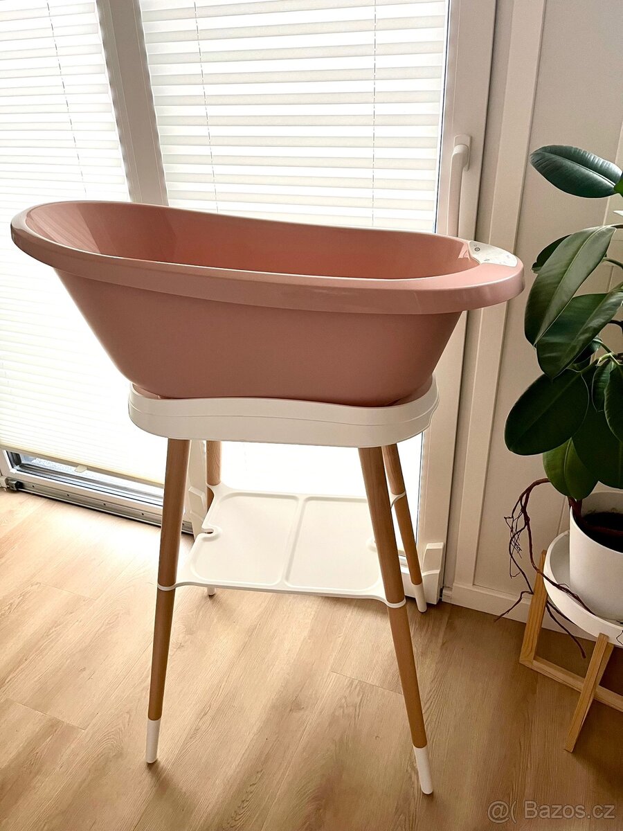 Sada komfortní digitální dětské vaničky s teploměrem Bébé-jou Sense Edition v růžové barvě a luxusního stojanu.