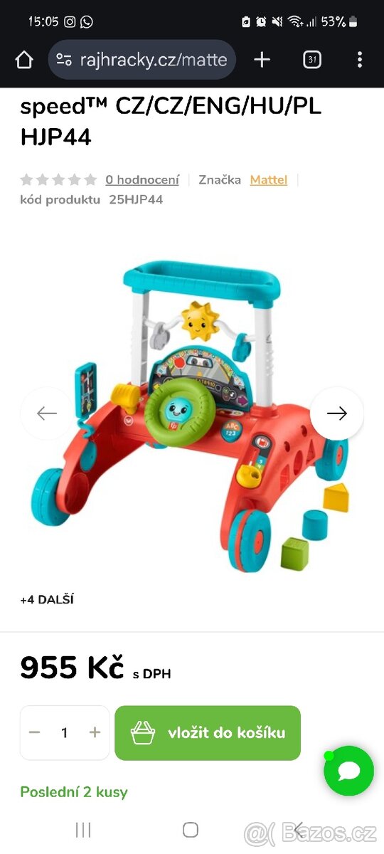 Prodám chodítko od Fisher Price, používané ale krásné - na fotkách jsou vidět kosmetické chyby a chybí kostičky. Svítí a hraje (video můžu poslat). Pořizovací cena je na první fotce.