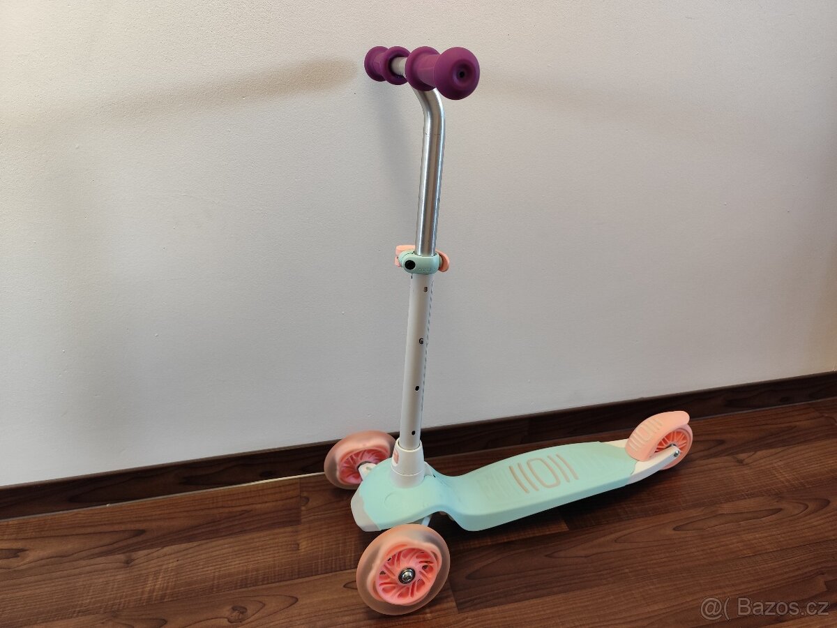 Prodám dětskou tříkolovou koloběžku s blikajícími kolečky z Decathlonu (Oxelo B1500). Pro děti 80-120cm. Málo ježděná - kolečka ještě blikají. včetně originální krabice.