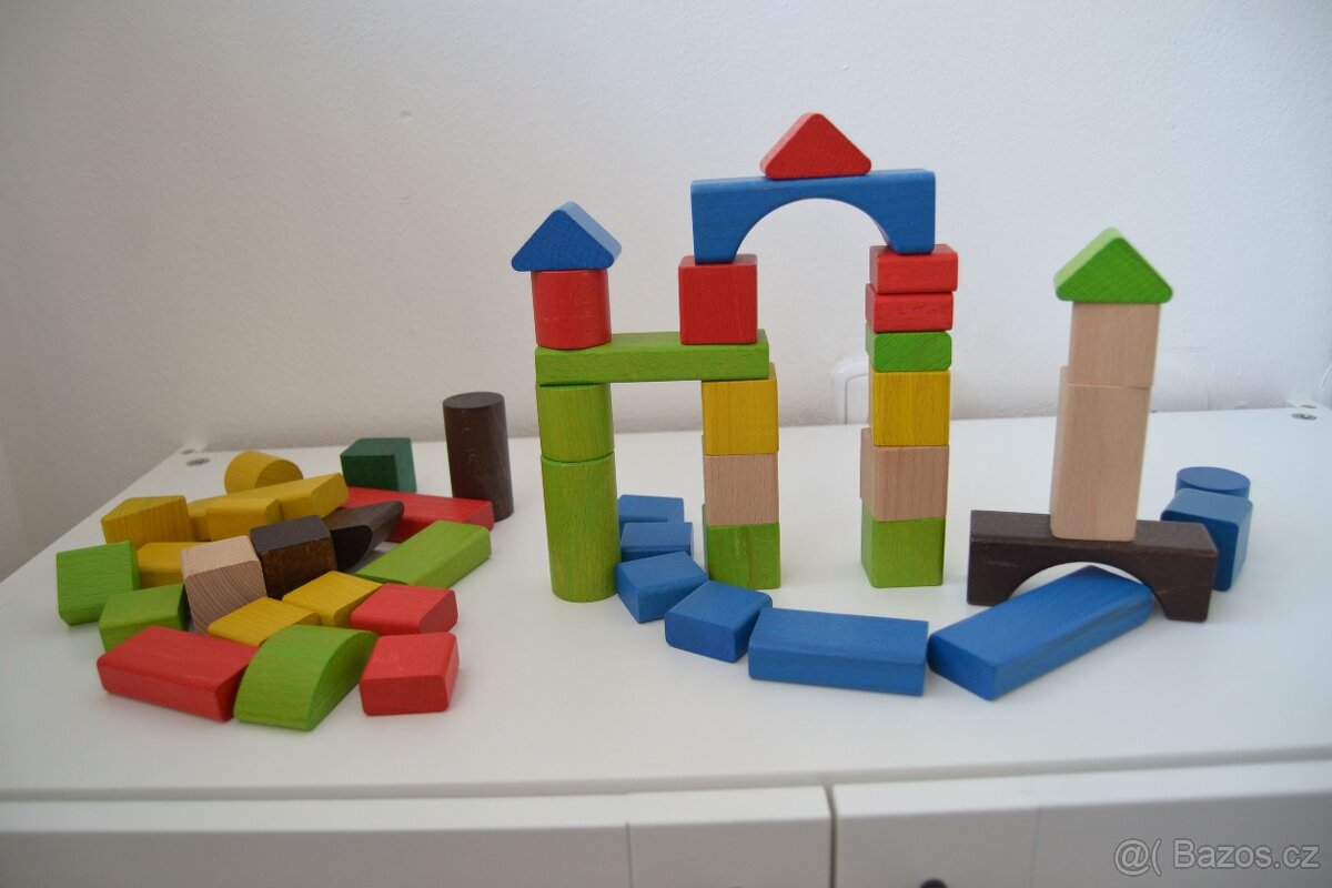 Dřevěné barevné kostky 50 kusů. Kupované nové, po jednom dítěti. Málo hrané. Kostička má rozměr 3,2 x 3,2 cm. Předání v Českých Budějovicích nebo poslání.