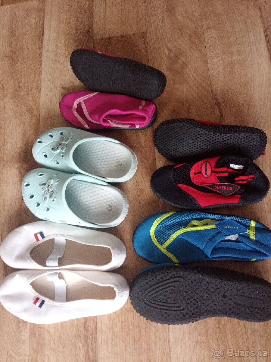 Prodam velmi zachovale jako nove detske boty do vody-moře,modre loap vel.30,cervene vel28-32, ruzove vel.26,cvicky vel.32,pantofle modre vel.29