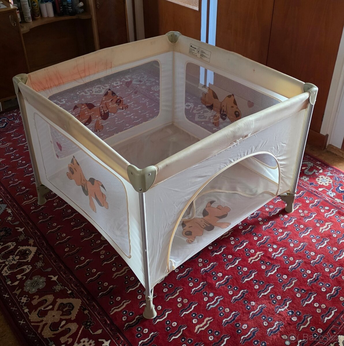 Dětská ohrádka 100x100cm - [28.1. 2026]Dětská skládací ohrádka.Používána o velikosti 100x100cm.Skládací takže skladná viz.foto taška.Vyčištěná parním čištičem v síťce zašitá malá dírka.