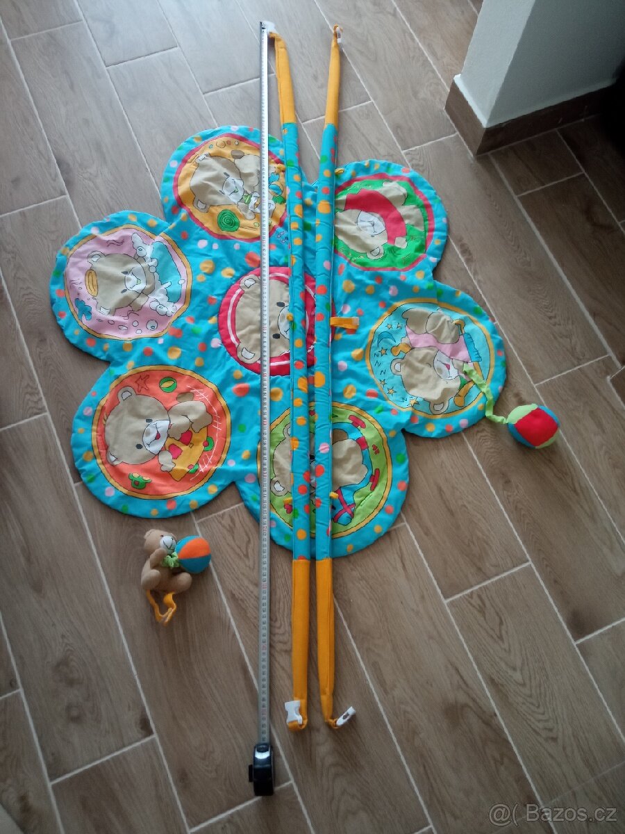 Hrací deka, pěkný stav, maličko ušmudlané žluté části, ale téměř není vidět. Ze spodní strany trochu žmolky u spon. Medvídek se dá natáhnout a vibruje.