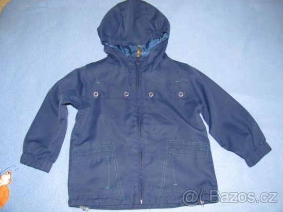 krátce nošená krásná-prďácká modrá bunda v.86- je větší 92/98,uvnitř silonová podšívka,na zádech dopravní prostředek(autobus),zvládne mrholení,super stav,využitelná jaro,chladné léto,teplý podzim