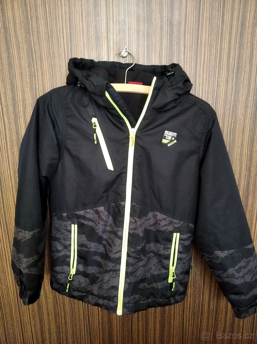 Prodám chlapeckou lyžařskou bundu zn. SAM 73, černá barva v kombinaci s černošedým vzorem typu ""maskáč"", viz foto. Vel. 152, délka 59 cm, šířka 49 cm, délka rukávu 57 cm. Reflexní prvky, vnitřní kapsička na suchý zip, kapsička na rukávu na skipass. Všitý bederní pás, v partii zad a v kapuci flís. Bezvadný stav. Osobní odběr nebo mohu zaslat zásilkovnou, balíkovnou.