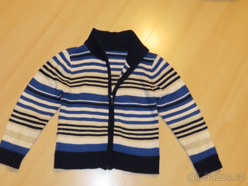 Prodám dětský svetr cm, vel.122-128, se stojáčkem a zapínání na zip, rozměry: délka 45, šířka 36cm, délka rukávu od ramene 46cm, trocha žmolíků, ale službu ještě udělá. Cena 50Kč.
