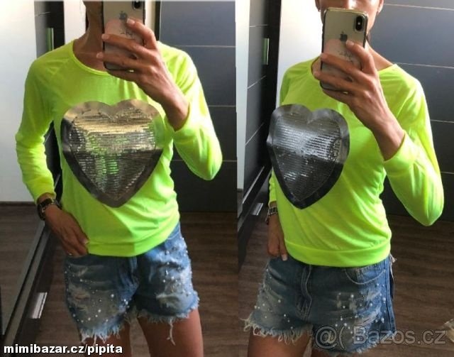 Moc hezká slabší mikina neonové barvy, na přední straně aplikace srdce, která je vyplněná stříbrnými flitry. Materiál 65% bavlny, 35% polyester. Velikost S. Nová. Nevhodný dárek.