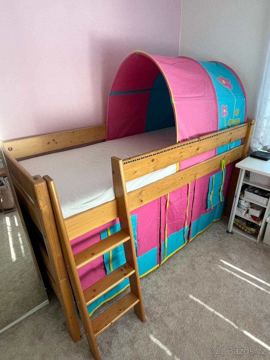 Patrová postel z masivu. Rozměr lůžka: 90x200 cm, výška 120 cm. Součástí je rošt, dvě látkové područky - zelená a oranžová (mají snímatelný potah na zip), matrace Jysk WellPur GoldF30 (18cm vysoká pěnová matrace s pratelným potahem se zárukou 25 let - doklad mám), dětský domeček pod postel oranžovo - zelený, dětský domeček včetně tunelu modro - růžový, dětské osvětlení pod postel (viz. foto), na přední a pravé části postele je nalepen pásek s LED osvětlením (nastavení barev skrz dálkové ovládání). Postel je v rozebraném stavu (návod mám). Pouze osobní odběr. V případě domluvy mohu do rozumné vzdálenosti od Příbrami dovézt.
