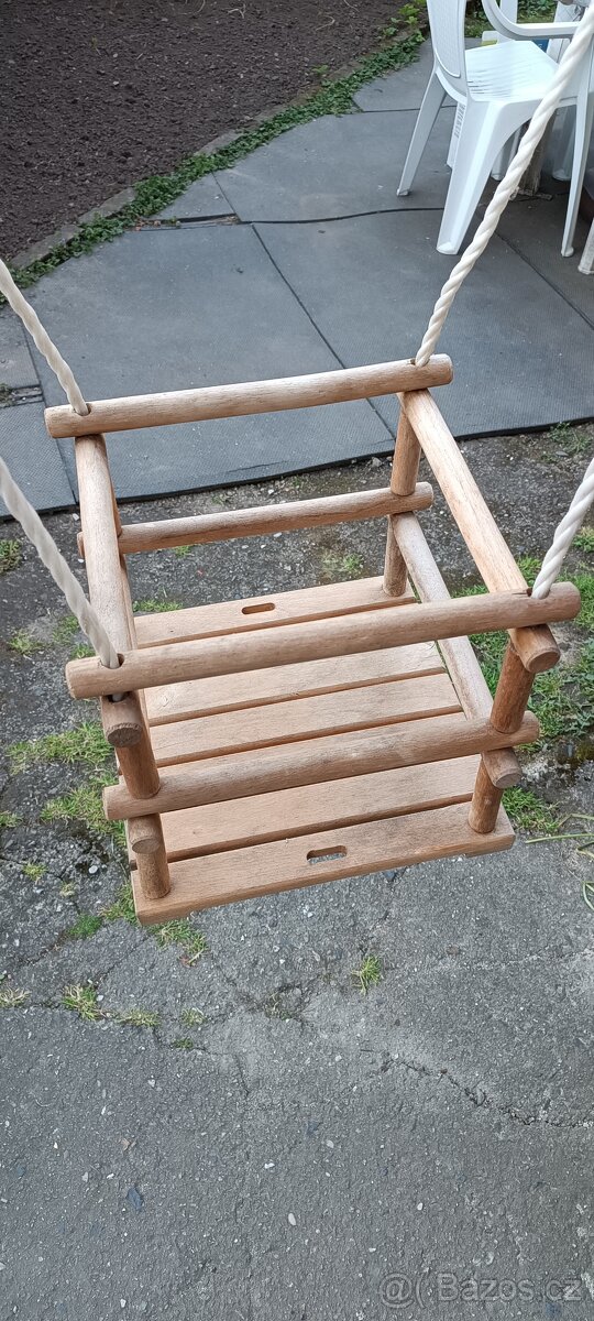 Dřevěná houpačka pro děti - [3.1. 2026]Prodám dřevěnou houpačku pro děti viz foto. nastavitelná délka/výška, možnost přivázat vstup aby dítě nevypadlo, ale to už naše šikovné děti zničily, ale kousek provázku má doma snad každý.