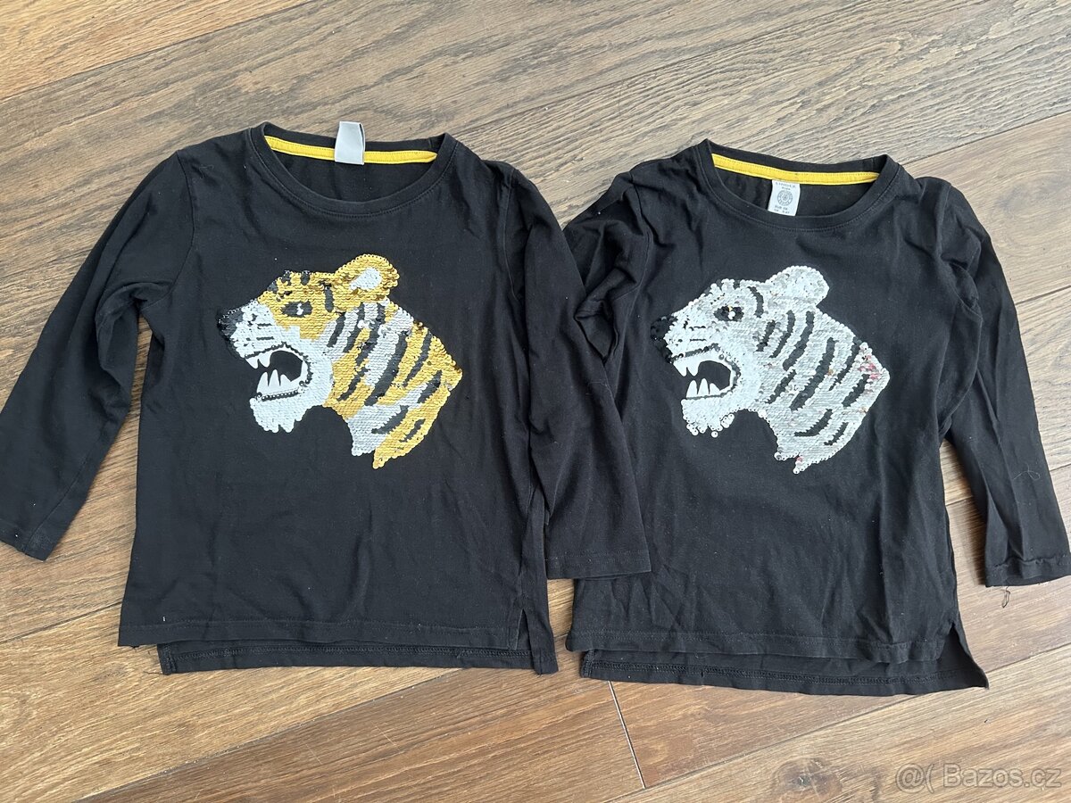 Černá trika s dlouhým rukávem a flitrovým obrázkem (zlatý/stříbrný tygr). Vel. 116
