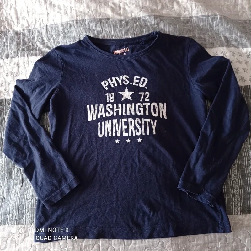 Modré triko s dlouhým rukávem s potiskem vel.140 je za 49Kč.
