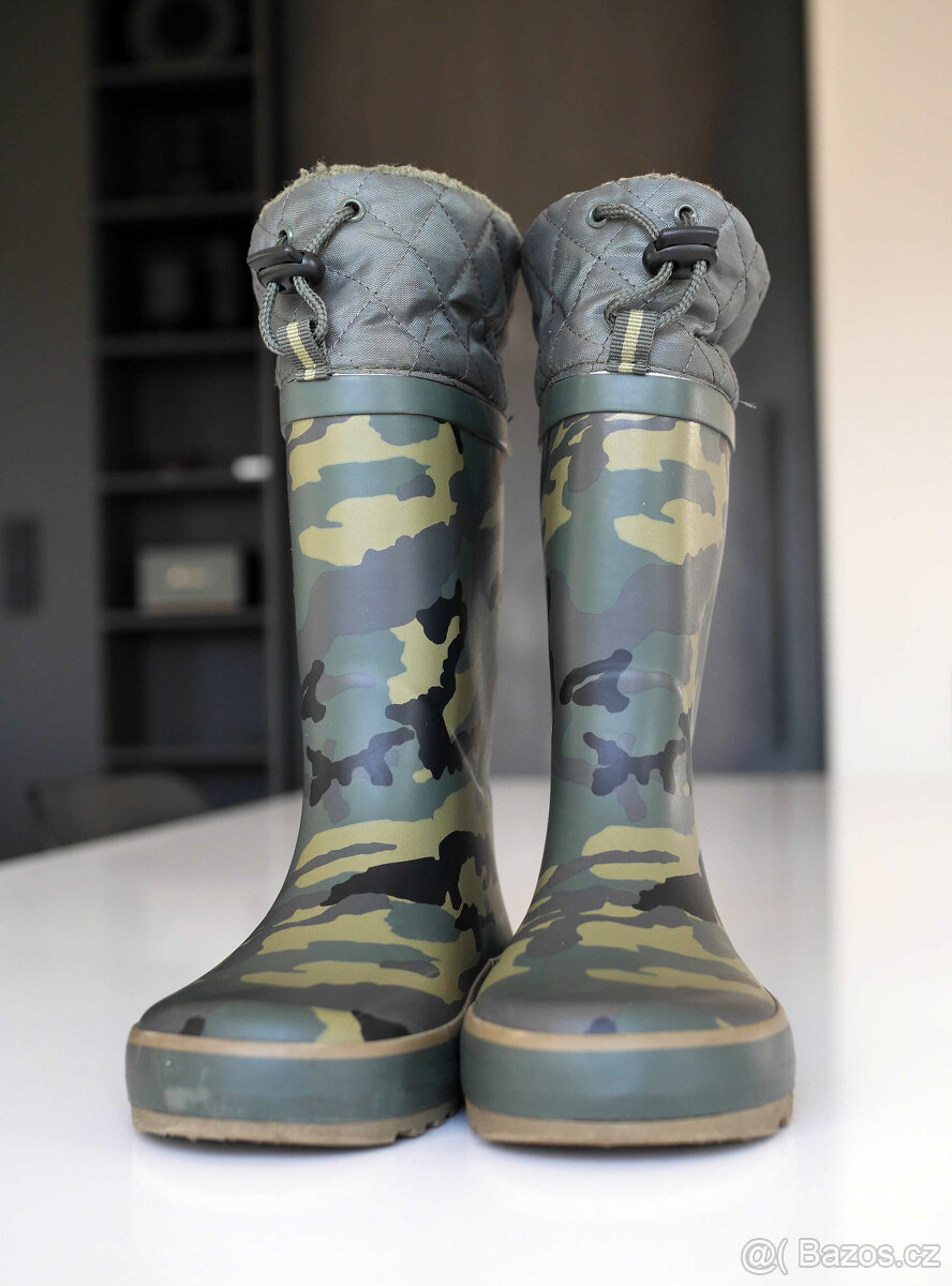 Prodám dětské holínky od anglické značky Next v maskáčovém provedení. Holínky jsou velikosti 34,5 s látkovým lemem a 3M Thinsulate Insulation membránou. Díky zateplení se dají nosit celoročně, membrána zajišťuje teplo a odvod vlhkosti. Svrchní část holínek a podrážka jsou gumové, podšívka a stélka jsou z textilu. Délka stélky je 22,5 cm, šířka stélky je 8,3 cm. Holínky vykazují běžné známky opotřebení. S tímto typem holínek jsem byla vždy velmi spokojena a kupuji ho i dále ve větších velikostech. Pořizovací cena maskáčových holínek byla 875 Kč.