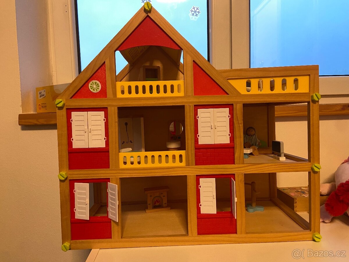 Dřevěný domeček s nábytkem a postavičkami. Používaný, ale stále dobrý stav.