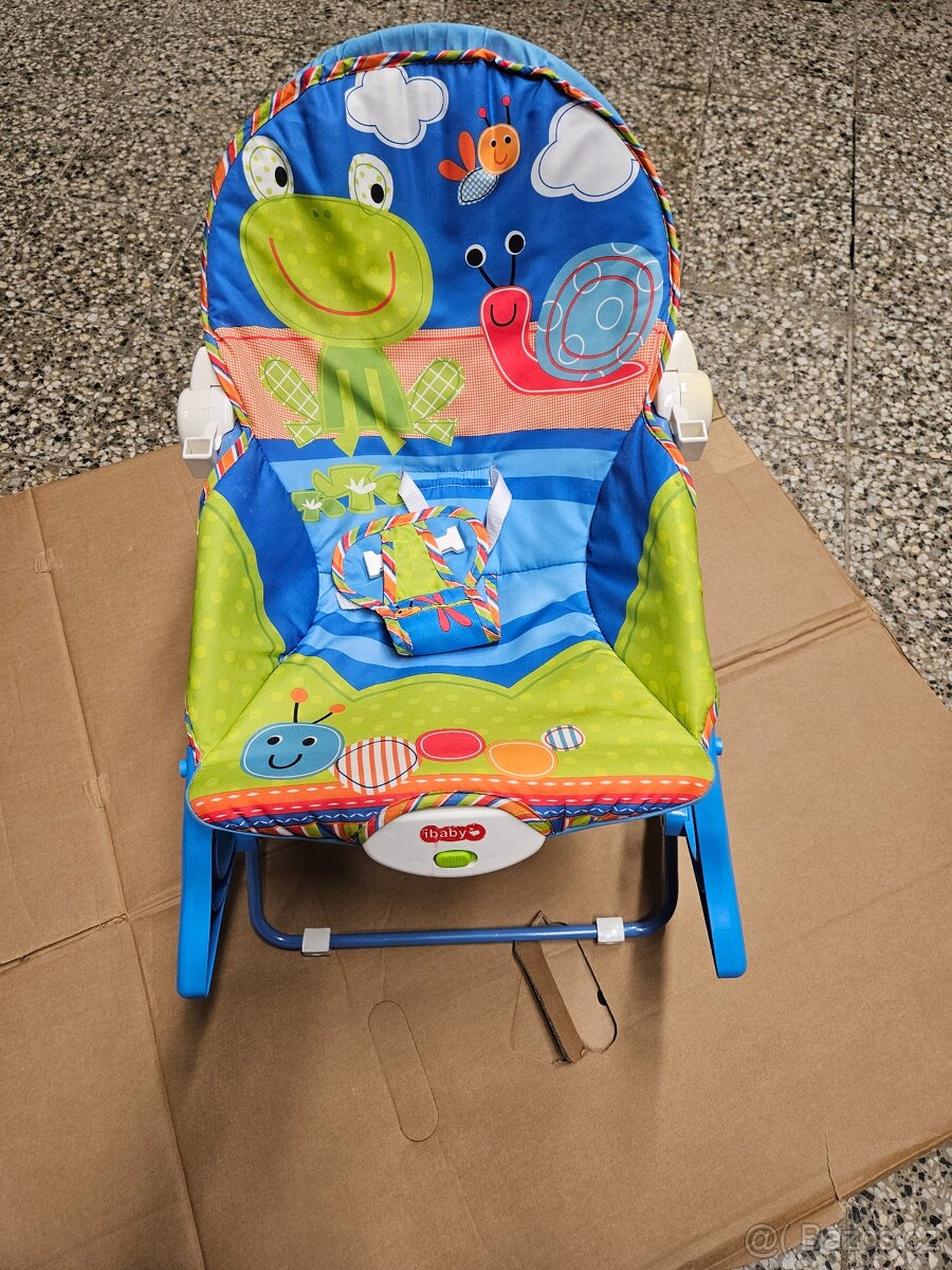 Sedátko má pratelný barevný potah; hrazdičku a 2 hračky; funkci uklidňujících vibrací (baterie vyjmuta ze sedátka = vybitá); bezpečnostní pás; fixační stojánek; sklápěcí opěradlo.