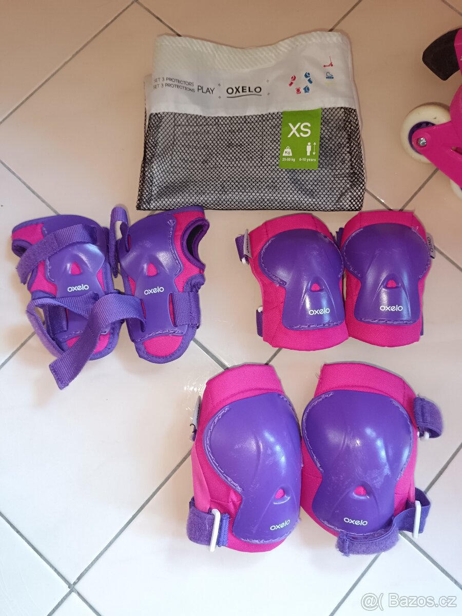 Prodám rostoucí kolečkové brusle po dceři. Jsou odřené z boku. Na funkčnost to nemá vliv. Dám k tomu i chrániče. Ty jsou pro holčičku cca do 10 let. Dcera má vše malé, proto prodávám.