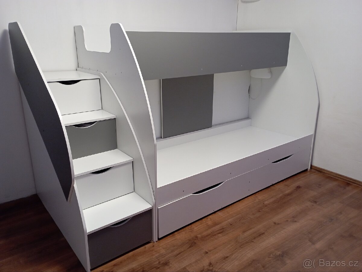 Prodám dětskou patrovou postel se spoustou úložného prostoru.Záda spodního lůžka mají posuvné dveře za kterými je prostor s poličkami.Dalším prostorem je velké šuple pod postelí a šuplíkové schody.Postel má menší známky opotřebení viz foto,jinak v naprostém pořádku.V zádech jedné skříňky provrtána dírka na protažení kabelu od světýlka.Světla nejsou součástí prodeje.Možno přidat menší zábranu k dolnímu lůžku.Vrchní lůžko má i po vložení matrace dostatečně vysokou zábranu.Bez matrací. Nutno osobní vyzvednutí a vlastní odvoz.Po dohodě mohu předem rozmontovat.PC bez matrací 16000,nechám za 10000.