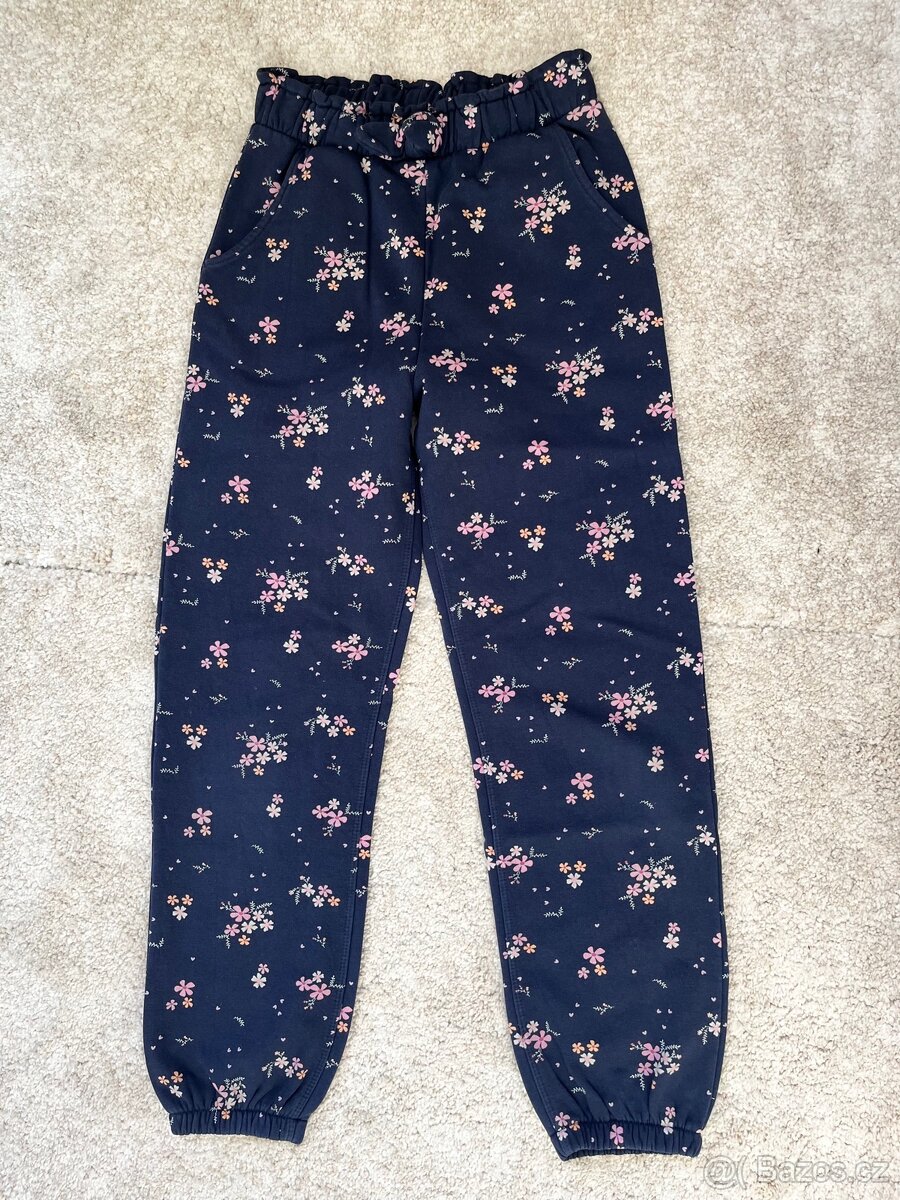 Prodám dívčí tepláky Kids. Velikost 146/152, tmavě modrá barva, drobné kvítky, top stav viz foto, bez vad. V pase na gumu. Šířka v pase 33cm, délka nohavice 97cm. Cena 150,- Kč