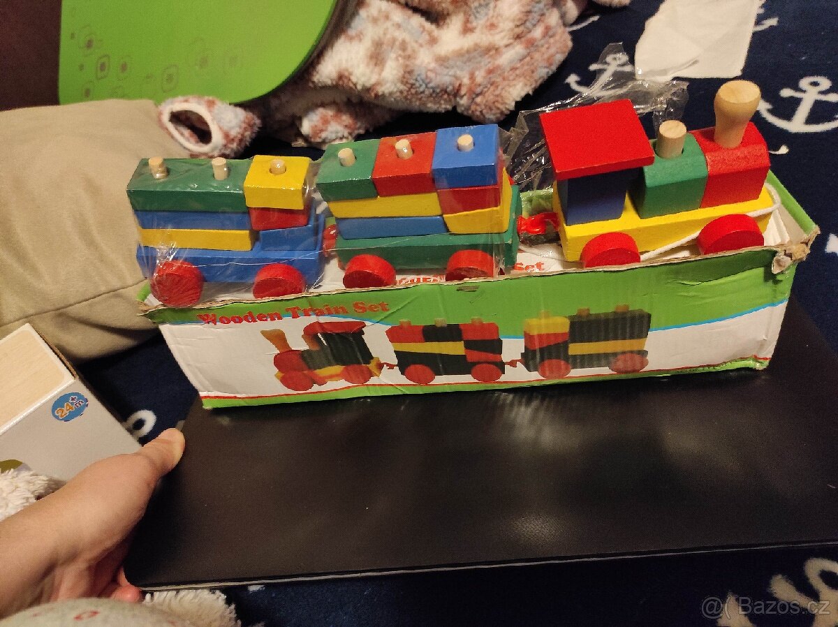 Malý skládací dřevěný vláček, nový, jen trochu poškozená krabice