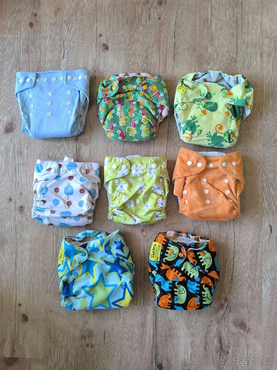 Použitá sada látkových plen různých značek 8 ks, s vkládacími vložkami, lze opakovaně používat a prát.